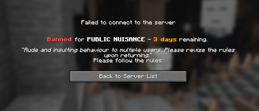 For the majority of my time on the server I have either been quiet or shutting down remarks and telling people to cool it, especially when poking fun turns into full on harassment. I am searching for clarification -- granted I know this may not be reviewed in time my 3 days are up, but I would like an explanation why this happened in the first place. Am I affected solely because Vav0k had an IP ban for three days or was it my own actions? Thank you.